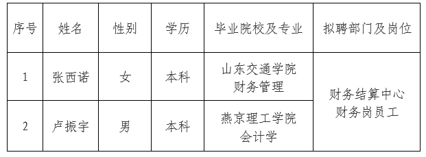 依据出资人代表机构审批意见,OD体育(集团)有限公司官网委托第三方机构面向社会公开招聘财务岗员工2人。现对拟录用人员信息进行公示,公示期间如有异议,可通过电话、信函等方式反映,反映意见请署真实姓名。